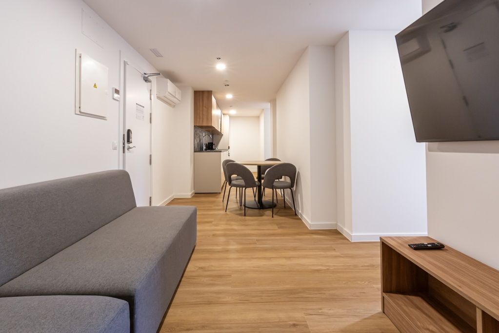 El área compartida de cocina y salón es amplia y funcional, pensada para disfrutar de momentos de relajación y socialización. La cocina está completamente equipada con un microondas, fregadero, nevera y una cafetera Nespresso para que puedas disfrutar de un café en cualquier momento. Además, cuenta con un amplio espacio de almacenamiento para mantener todo organizado. La zona de comedor incluye una mesa con capacidad para cuatro personas, perfecta para reuniones y comidas compartidas. Aunque no se incluye menaje, tendrás la libertad de organizar tus comidas y tentempiés a tu manera. El salón dispone de un cómodo sofá y una smart TV, y esta zona también cuenta con aire acondicionado específico para asegurar el bienestar de quienes la utilicen.